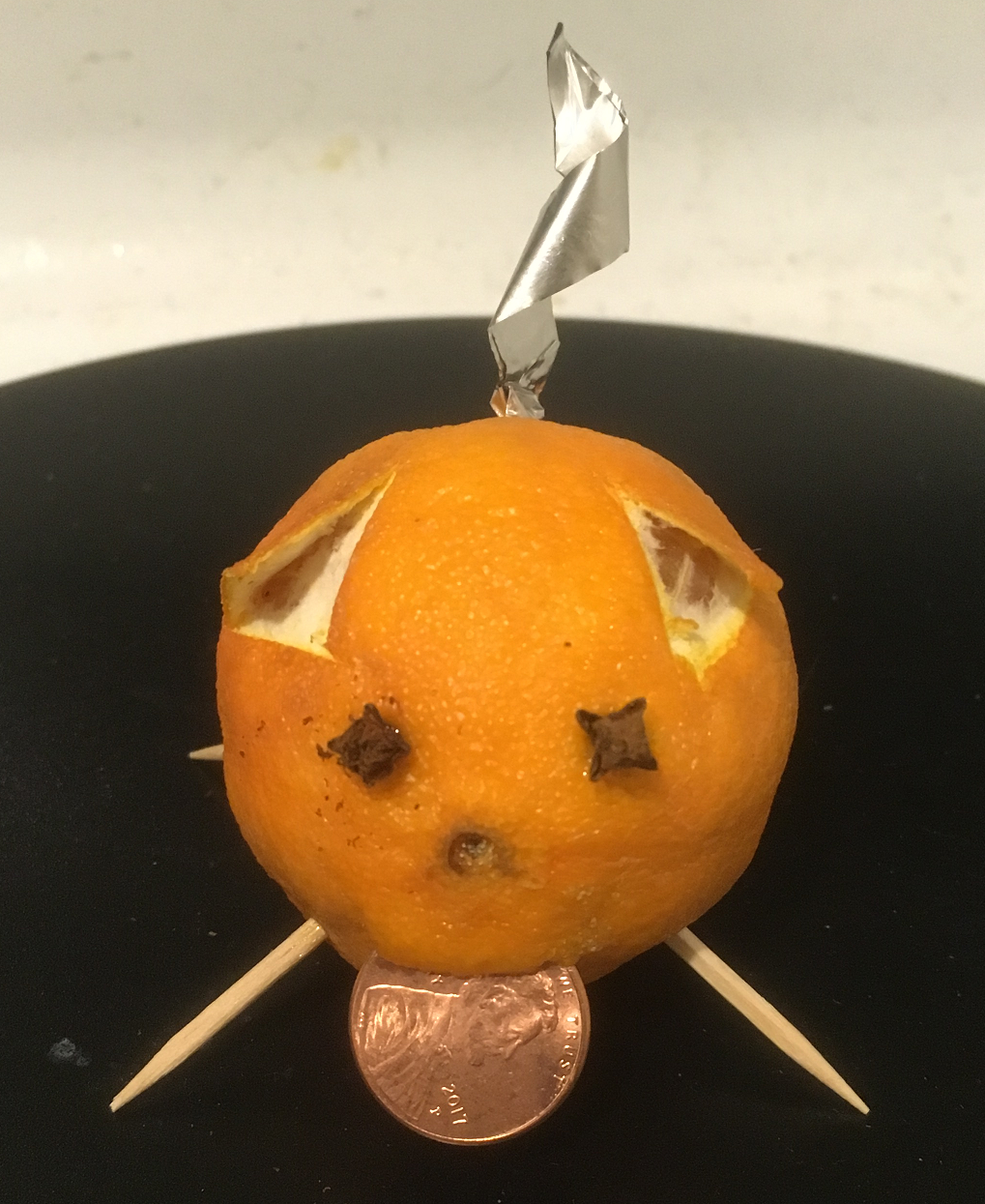 Pretty soon the '70s Dinner Party feed was full of fruit-based piglets inspired by my picture! I started to want in on it (even though I don't tweet). I had no lemons, but I did have a desiccated clementine, so behold, my good luck clementine piglet, wishing you all a happy new year: