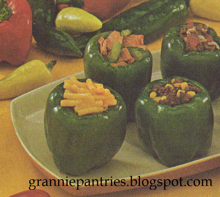 My fall posts are generally written waaay ahead of time because I'm so busy in the fall that I'd just have to abandon this thing if I didn't work ahead. This week, I had a little bit of extra time. (Thanks to online classes, I don't waste nearly as much time going places!) I was considering using a pre-written post for Saturday, but I kind of felt like using my time to look at an old cookbook... Didn't have a ton of time, though, so I decided I'd do an end-of-summer-produce post IF I could be lazy about it and not have to do a ton of scanning. Well, I picked stuffed peppers as my theme, picked up The Illustrated Encyclopedia of American Cooking (editors of Favorite Recipes Press, 1972), and holy shit! I hit the jackpot.