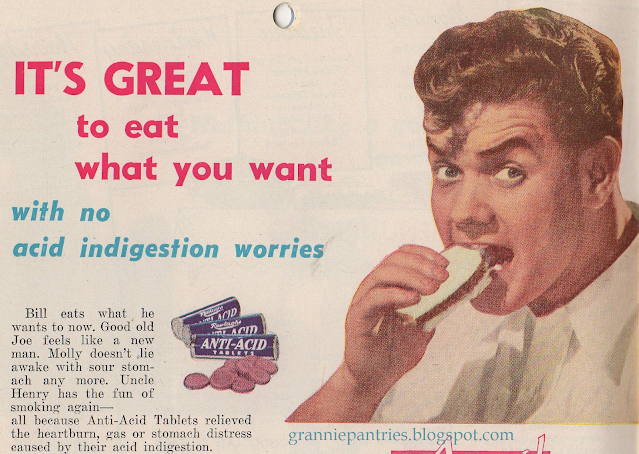 Not only does the ring mold feature ham, hard-cooked eggs, and asparagus floating in a cloud of mayonnaise-flavored gelatin, but the center of the ring gets filled with sliced avocado and American cheese! Yes. Let that sink in. Not only does the book manage to hit peak-1950s recipe construction, but it builds everything on a foundation of leftovers. No wonder I'm in love with this little book. (But not in love enough to make any of this stuff...!)