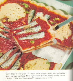 The caption tells that the special electric skillet baking method requires "no pot watching." What? Since when is pot watching the main impediment to making a homemade pizza, and how does using an electric skillet to bake the pizza get rid of that step? There's no pot watching when the pizza is in an oven either.